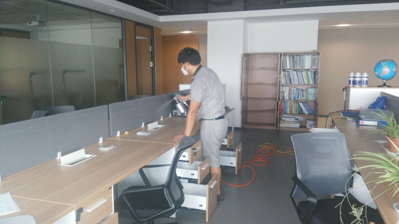 針對其結構特點及污染情況,我公司技術及施工人員采用專項專治的施工方案,針對重點污染區域,重點治理,對重新粉刷的墻面使用我公司研發的利純納米光觸媒進行甲醛清除,這些地方光照量較充足,便于光觸媒對甲醛的分解,對于刷漆的辦公家具、書桌、儲物柜、木門、地板等采用甲醛清除劑進行處理,針對不同污染物,做分別處理。經過我公司重點治理,一周后復查結果各種有害物質含量均已達到國家標準以內,各項指數均達標。客戶員工感覺氣味明顯消除,為業主清理甲醛,還顧客一個安全,健康的生活環境是我們全體工作人員的責任,下面為施工現場照片: